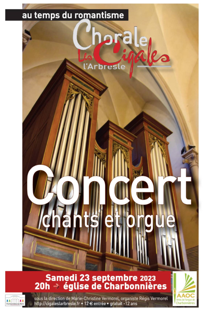L’Association des Amis de l’Orgue de Charbonnières a le plaisir de vous retrouver, en cette 23e saison de récitals, à un concert avec chants et orgue, avec la chorale « Les Cigales » de L’Arbresle, sous la direction de Marie-Christine VERMOREL, accompagnée à l’orgue par Régis VERMOREL, le samedi 23 septembre à 20h à l’église de Charbonnières-les-Bains, avec des œuvres romantiques.