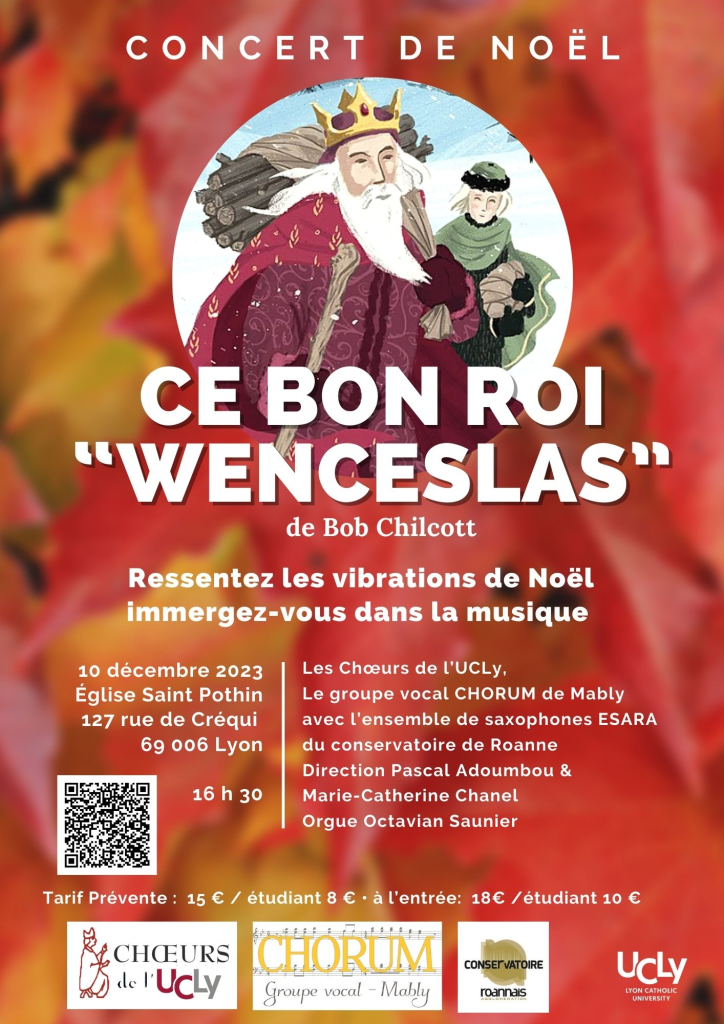 Le grand chœur de l’université catholique de Lyon offre un concert de Noël en l’église Saint-Pothin, ce dimanche 10 décembre, à 16h30. Nous chanterons, cette année, « le Bon Roi Wenceslas » de Bob Chilcott, et d’autres pièces de Noël.