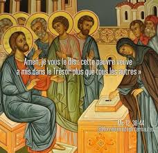 « Amen, je vous le dis : cette pauvre veuve a mis dans le Trésor plus que tous les autres. Car tous, ils ont pris sur leur superflu, mais elle, elle a pris sur son indigence : elle a mis tout ce qu’elle possédait, tout ce qu’elle avait pour vivre. »