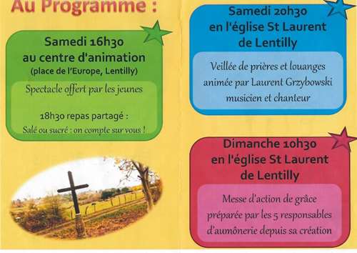 - 10h30 en l’église de Lentilly, messe d’action de grâce préparée par les 5 responsables de l’aumônerie qui ont œuvré au cours de ces 30 années