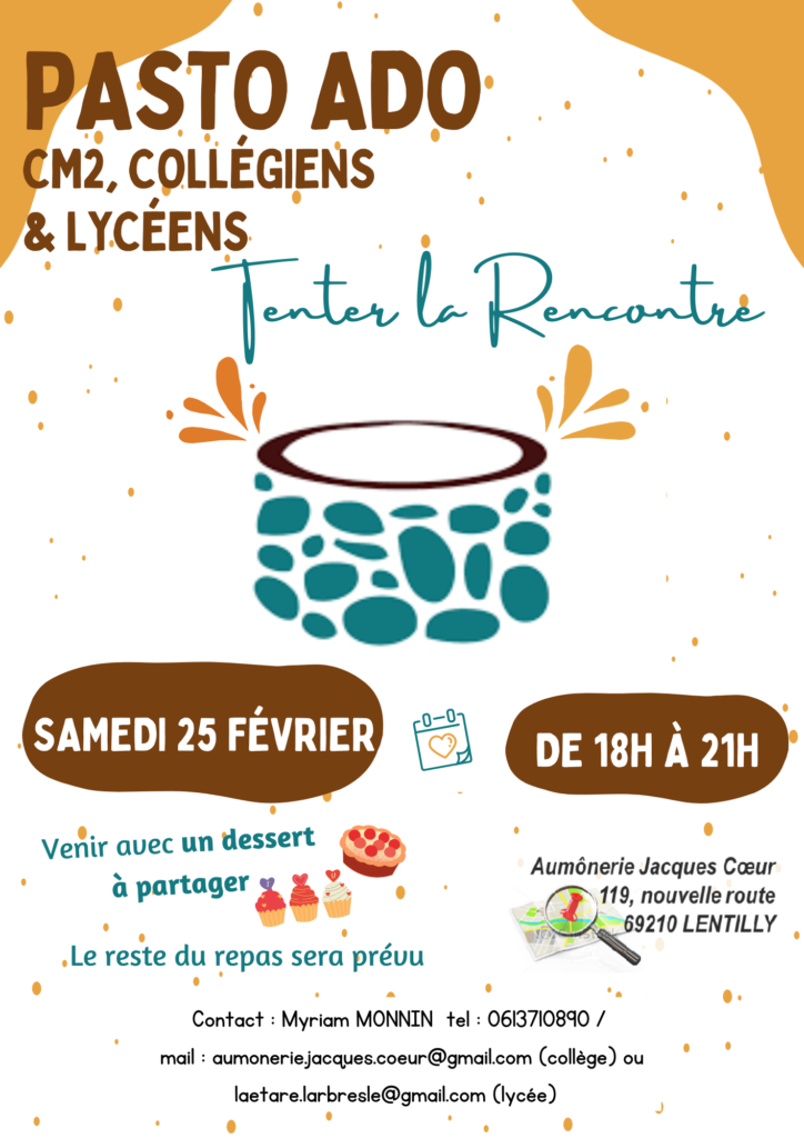 Tenter la rencontre : samedi 25 février de 18h à 21 h à l’aumônerie Jacques Cœur, 119, route nouvelle, Lentilly